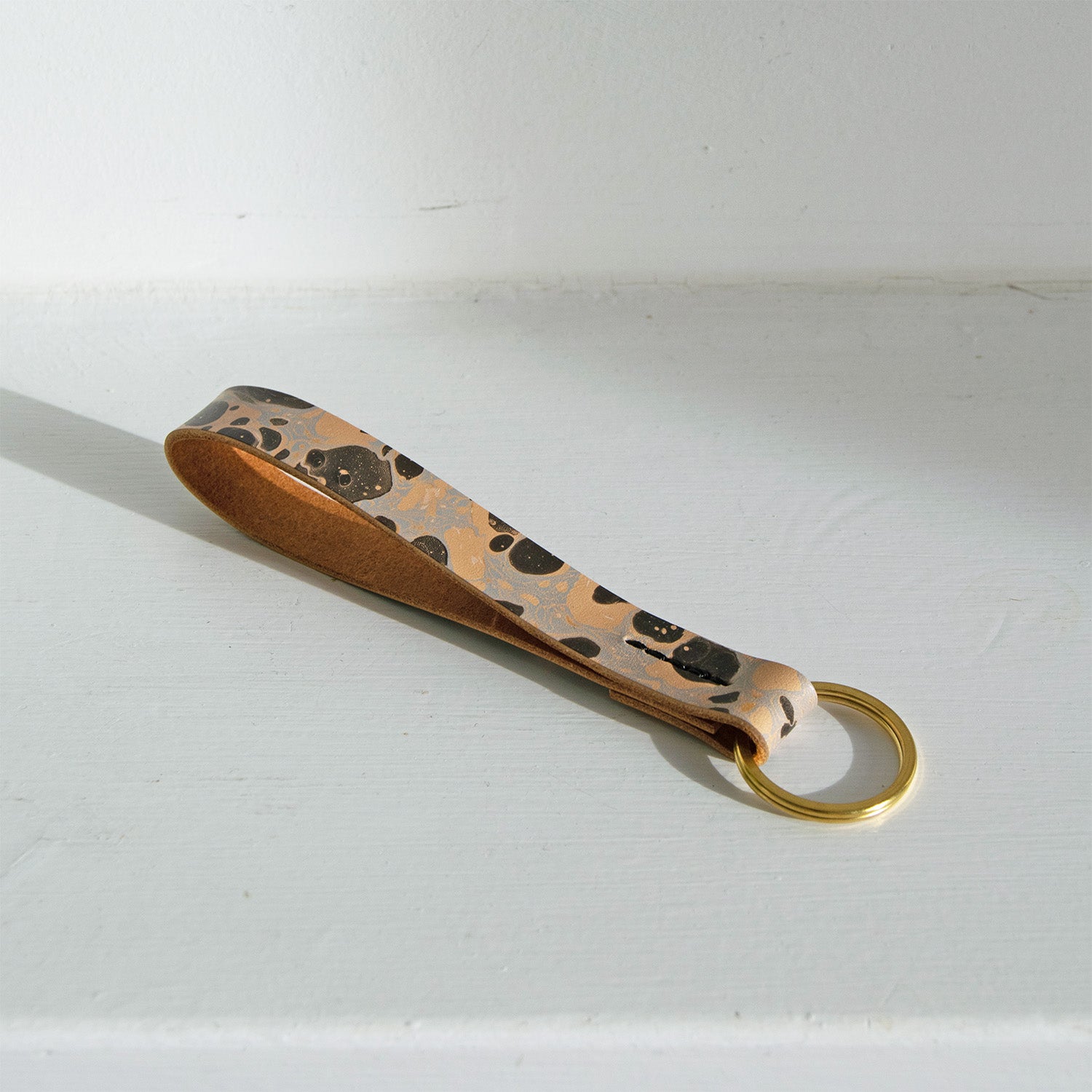 Marbled Leather Key Fob - Black & Dusty Blue Stone, Gold Accents