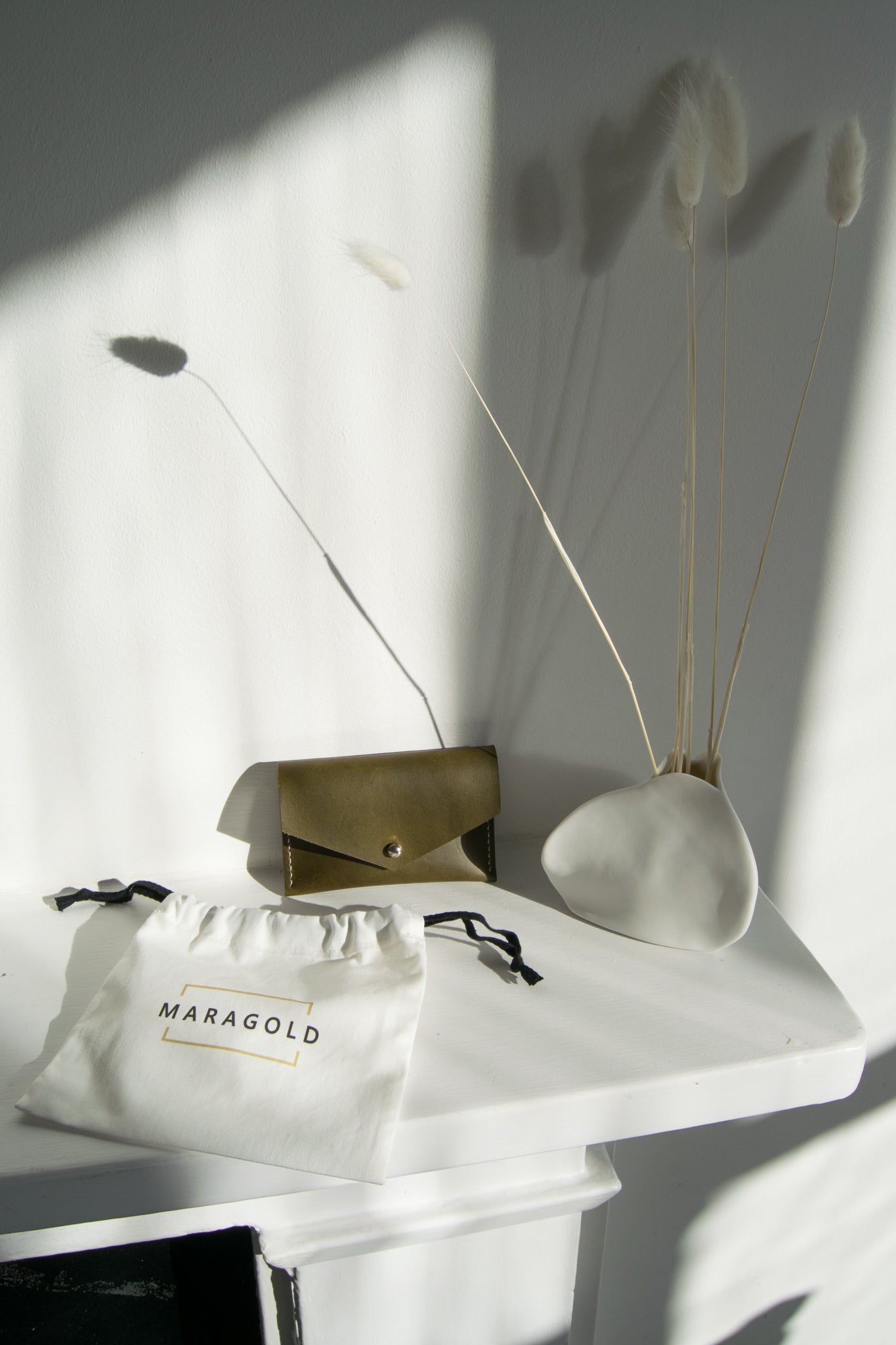 Premium Materials & Craftsmanship: Each olive green card holder is individually handstitched from Italian vegetable tanned leather sourced from a family-run Tuscan tannery. The geometric wool accent is crafted from 100% pure Burel wool from the Portuguese mountains - naturally water-resistant and incredibly durable. Available with ivory or ice blue wool accents (gold closure) or silver closure to match other Maragold pieces.
