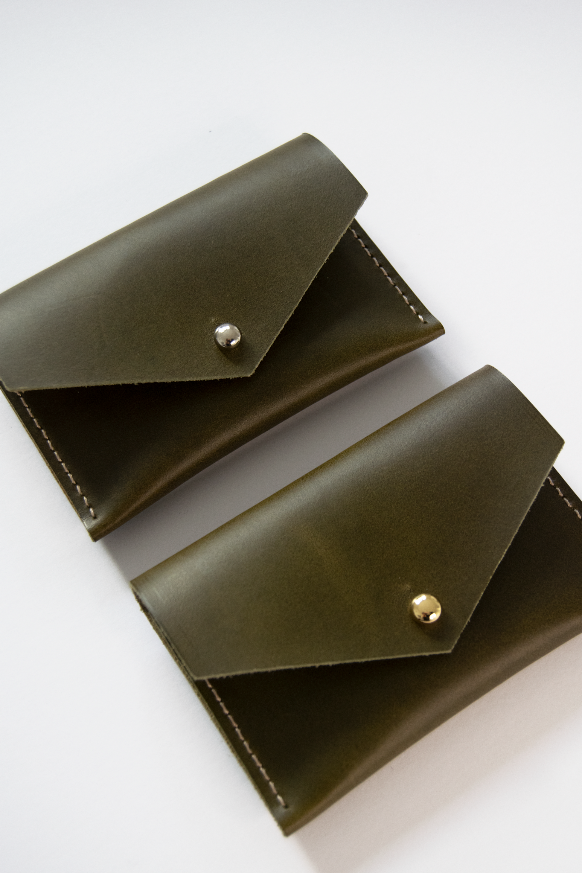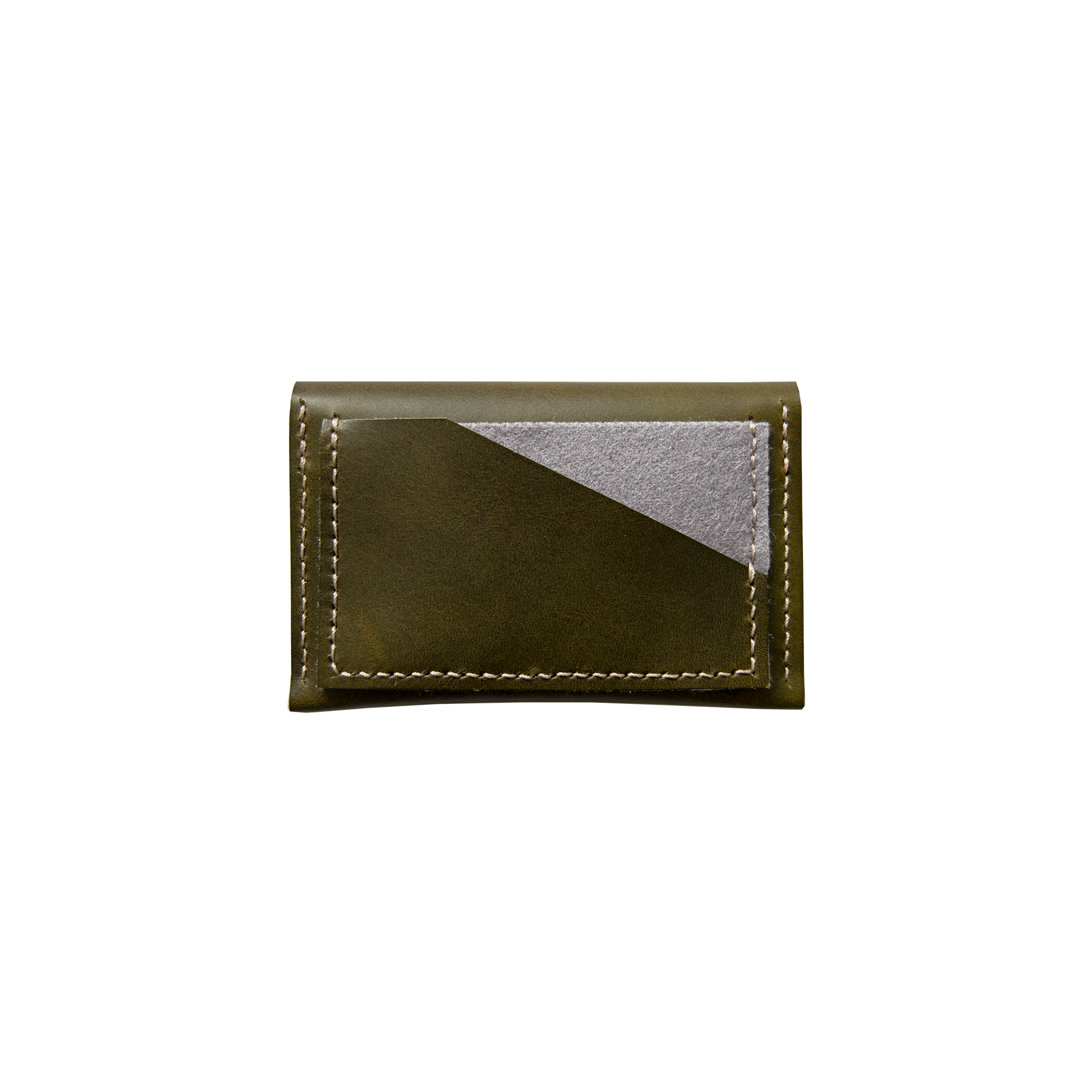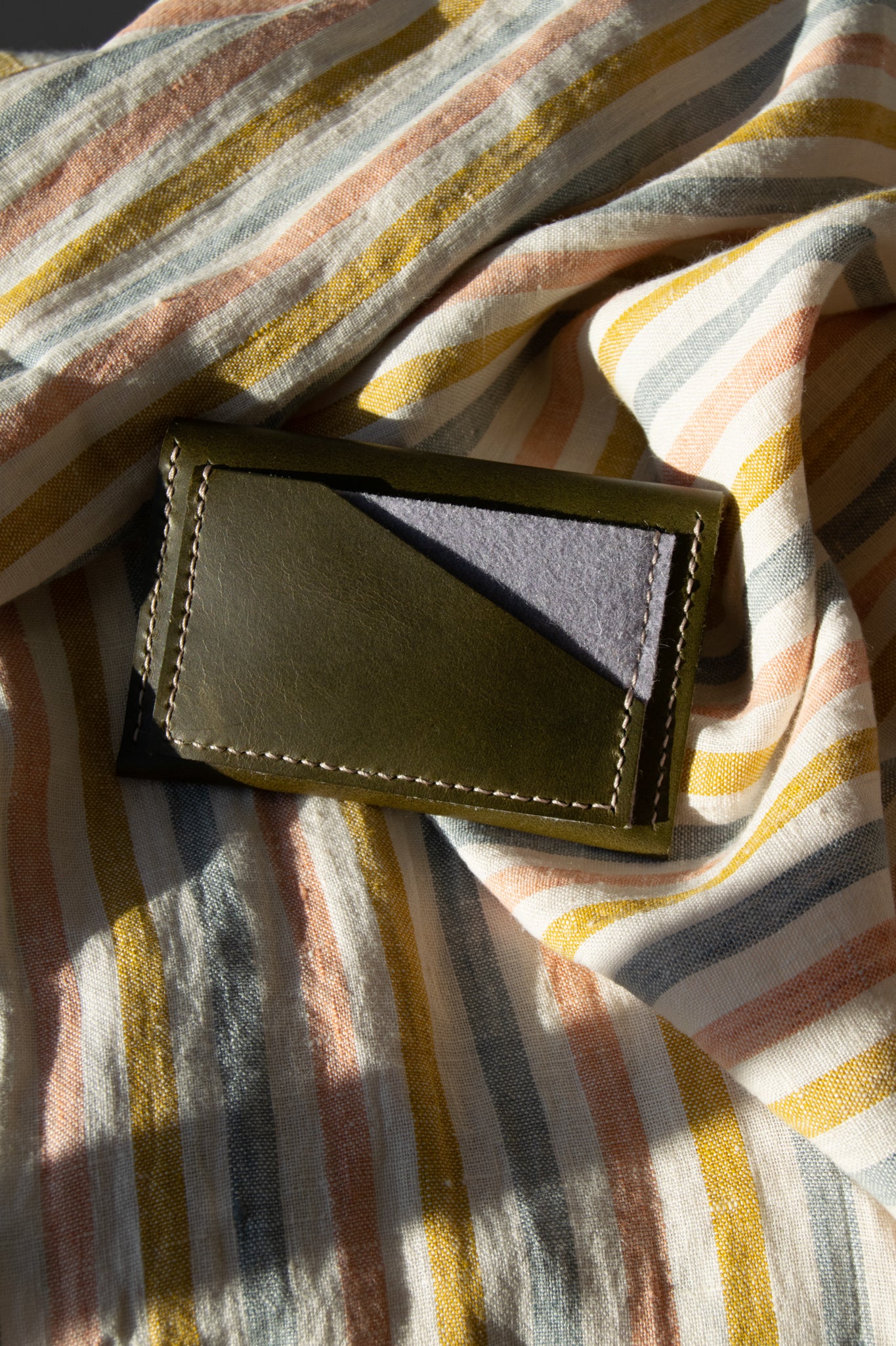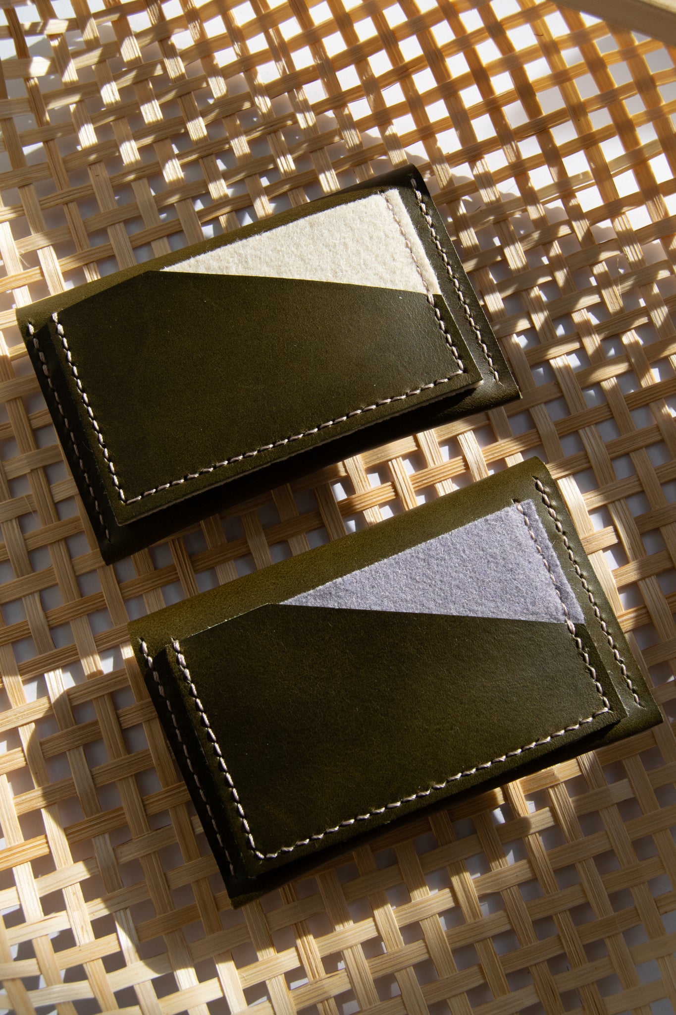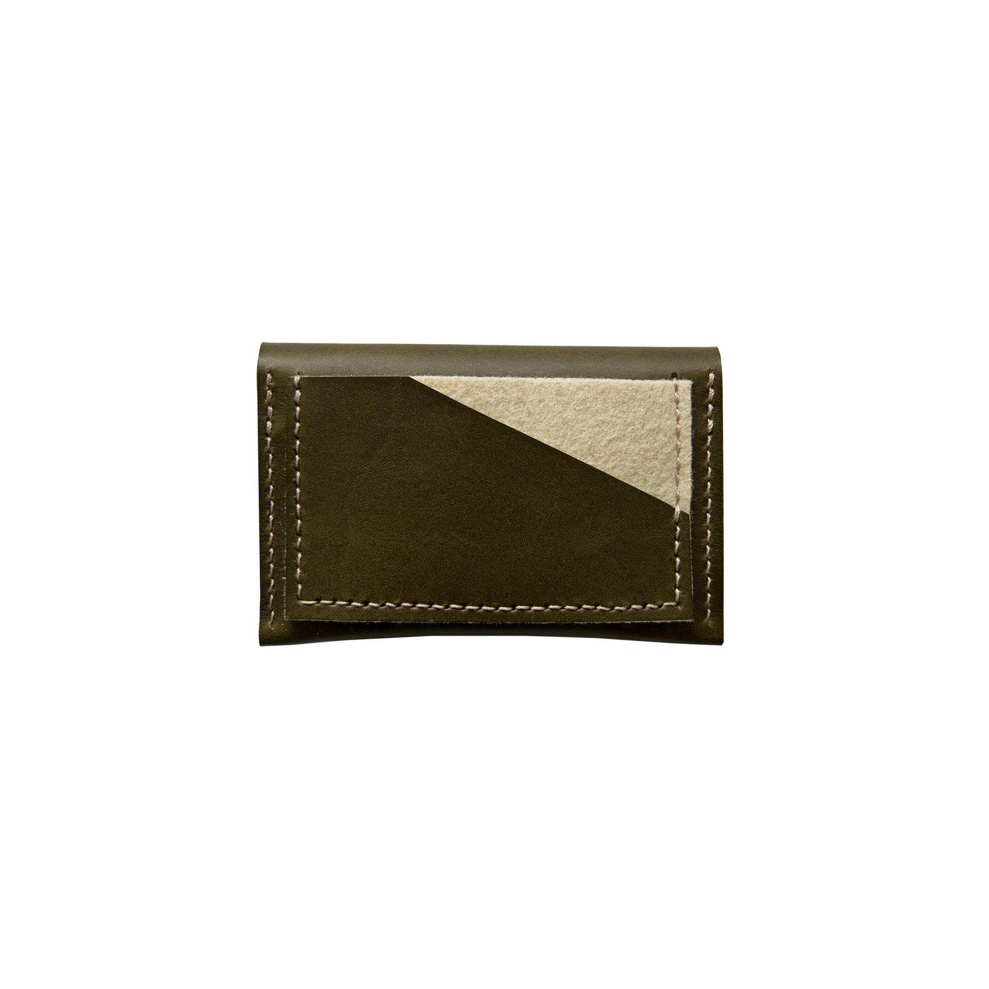 Carry your essentials in sophisticated style with this handstitched geometric leather card holder in rich olive green. Crafted from premium Italian vegetable tanned leather and accented with Portuguese Burel wool, this slim wallet perfectly balances form and function for the modern minimalist.