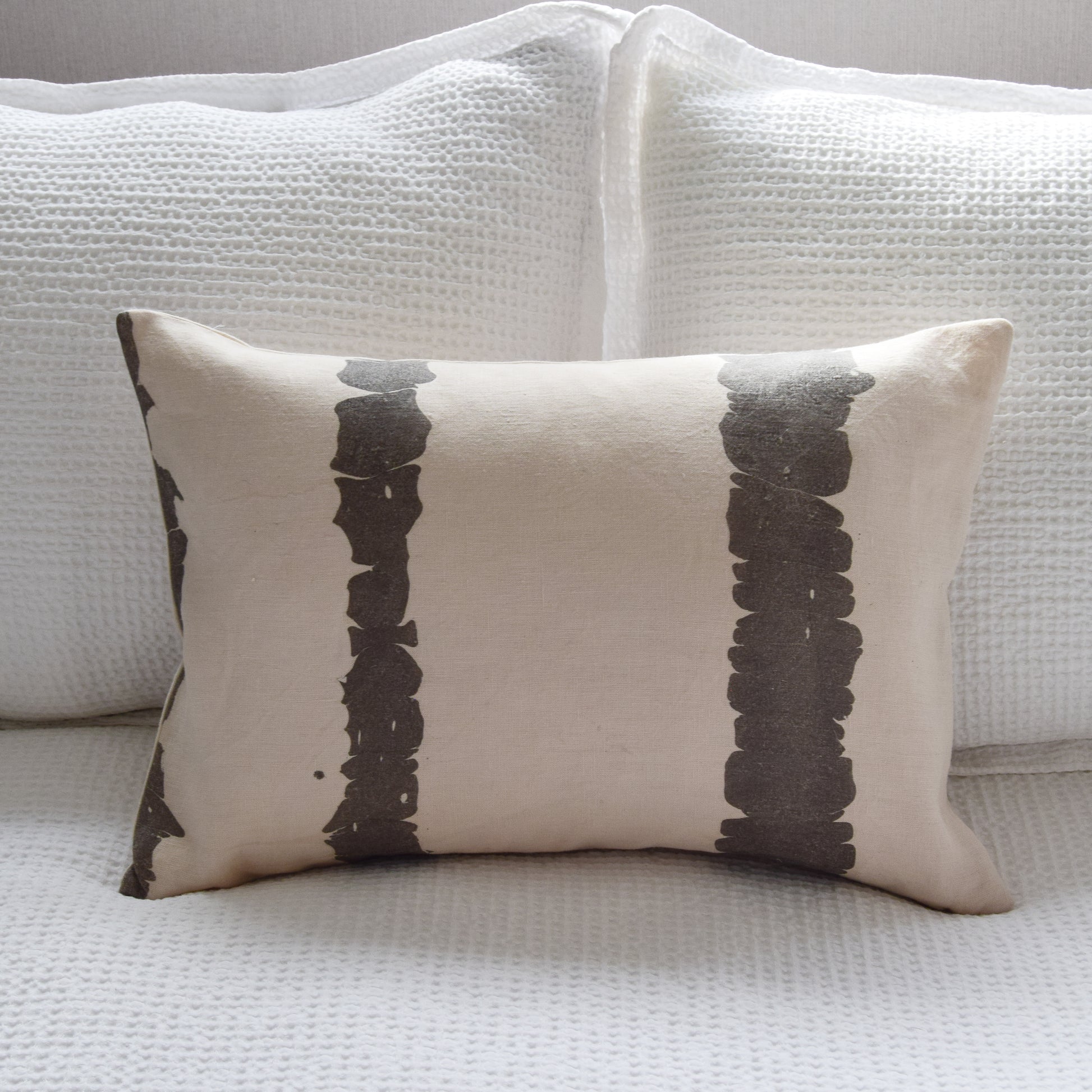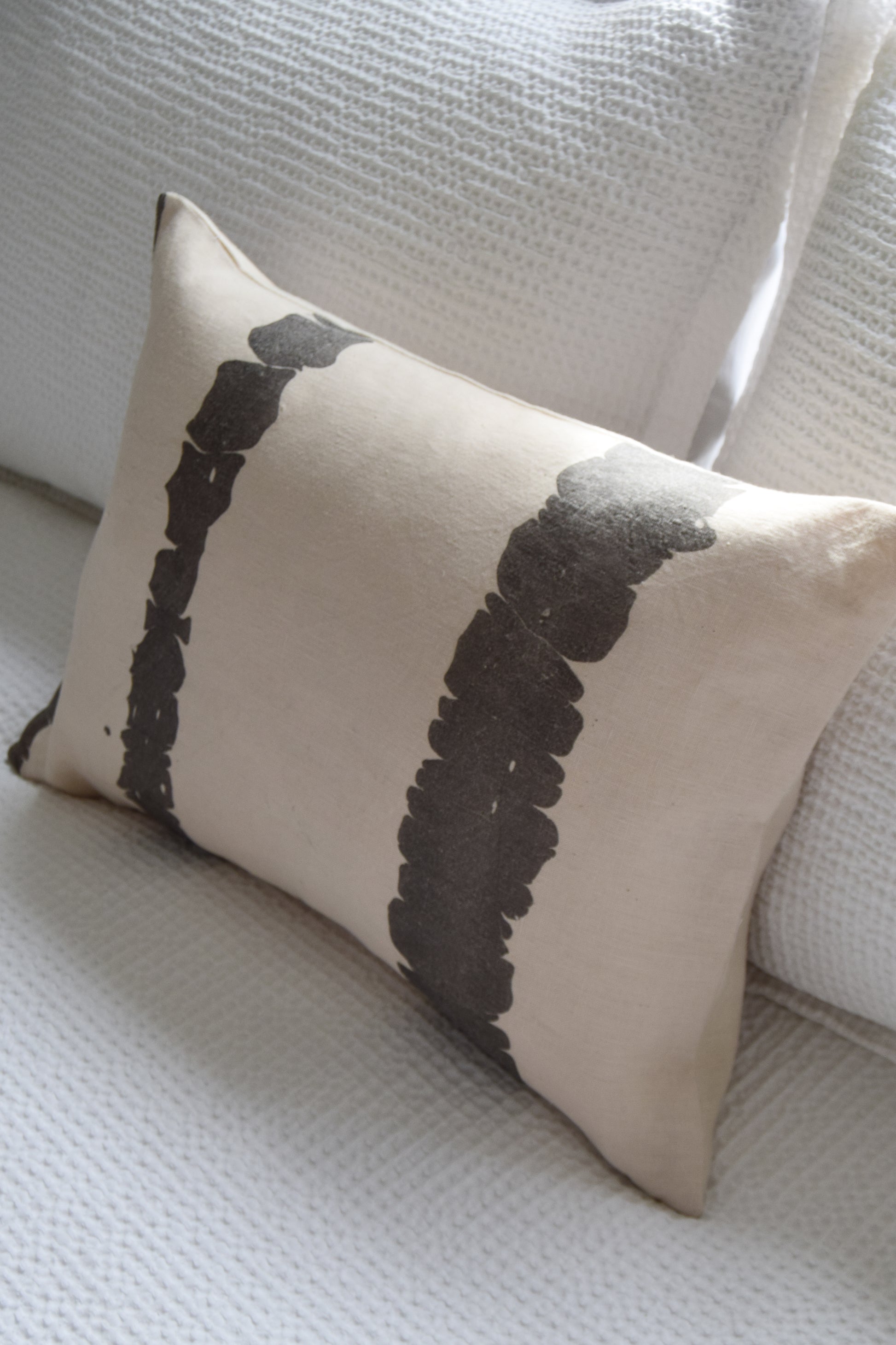 Elegant and understated, this handcrafted pillow features a hand-painted marbled stripe, contrasted beautifully against beige linen. The backing is made from 100% European linen, and each piece is sewn and finished by Julianna. Each piece carries subtle variations that make it entirely unique.