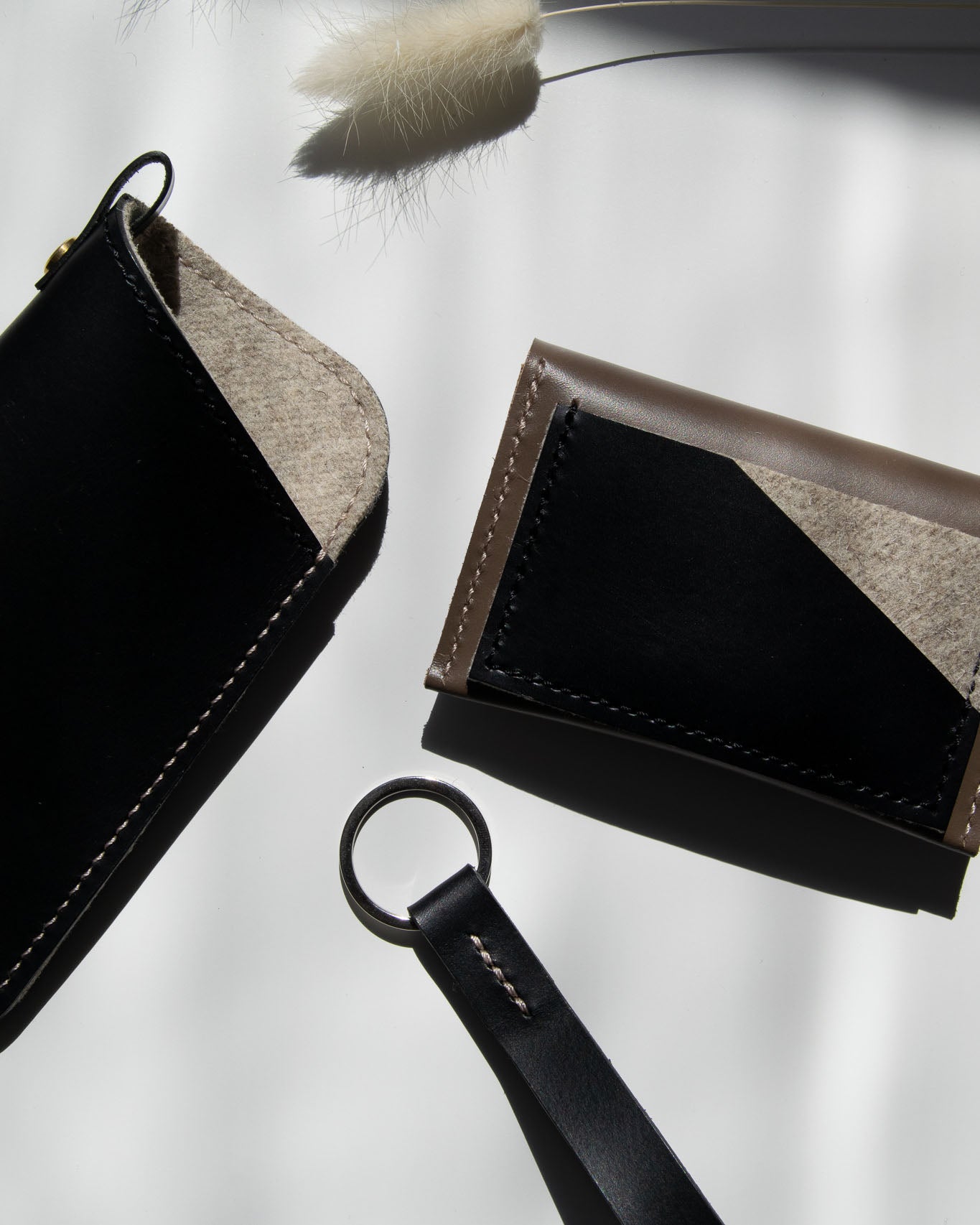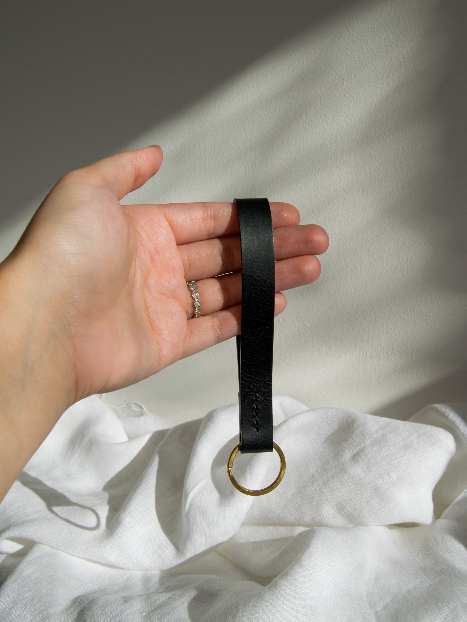- Available with a black or taupe stitch detail + silver keyring or black stitch detail + brass keyring.