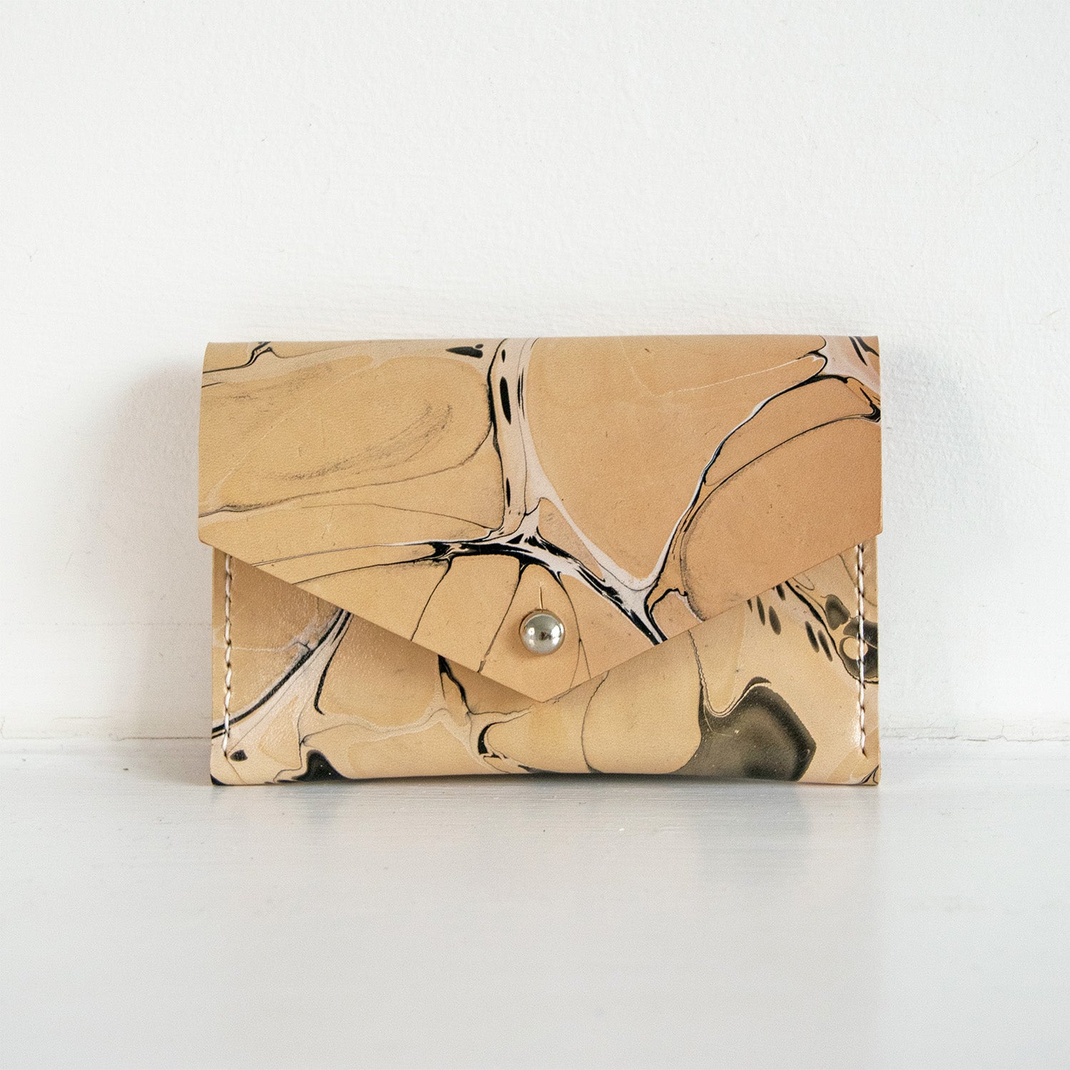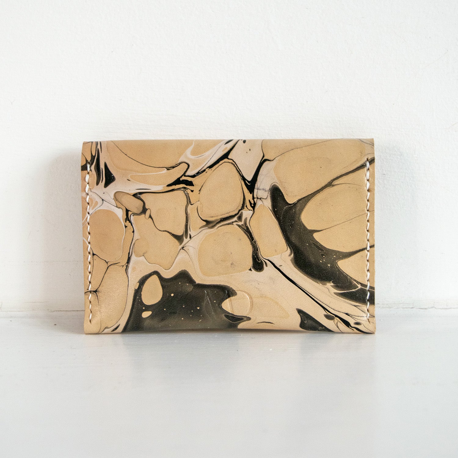 Timeless elegance meets artisanal craftsmanship in this envelope-style card holder. The bold contrast of black and white marbling creates striking patterns that make a sophisticated statement.
