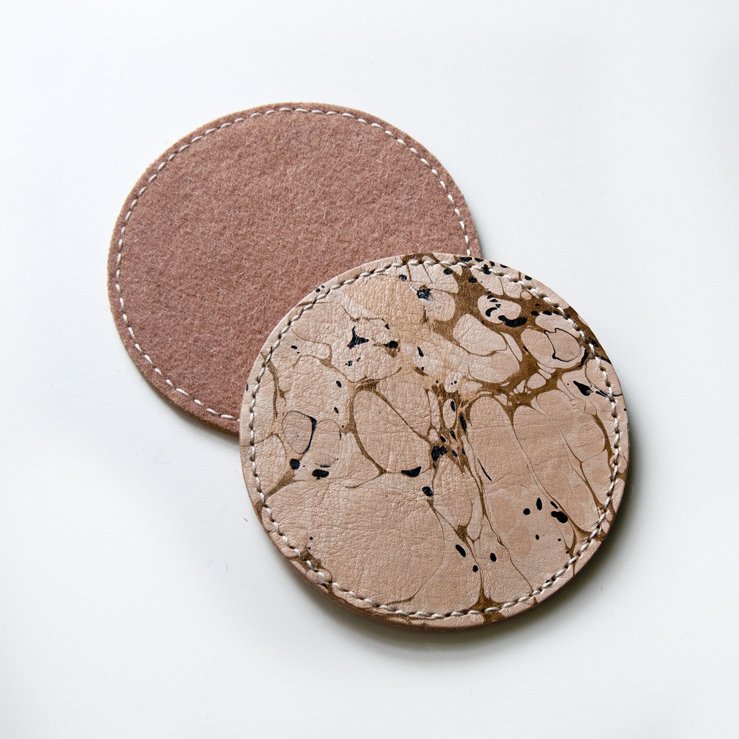 Premium Materials & Craftsmanship: These reversible coasters showcase premium Italian vegetable tanned leather on one side and luxurious Portuguese Burel wool on the reverse, creating a beautiful and functional accent for your home. Each piece is meticulously handstitched and will age beautifully, developing a rich patina with everyday use. The thoughtful dual-material design provides both style and protection. The marbled variation is crafted from hand-marbled leather, each one being one-of-a-kind.