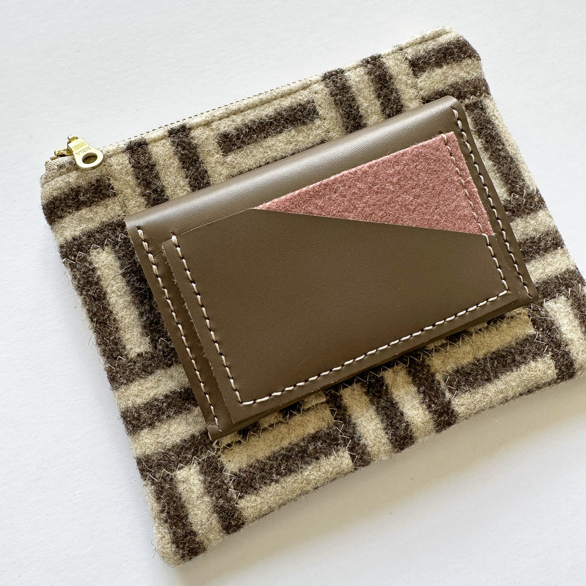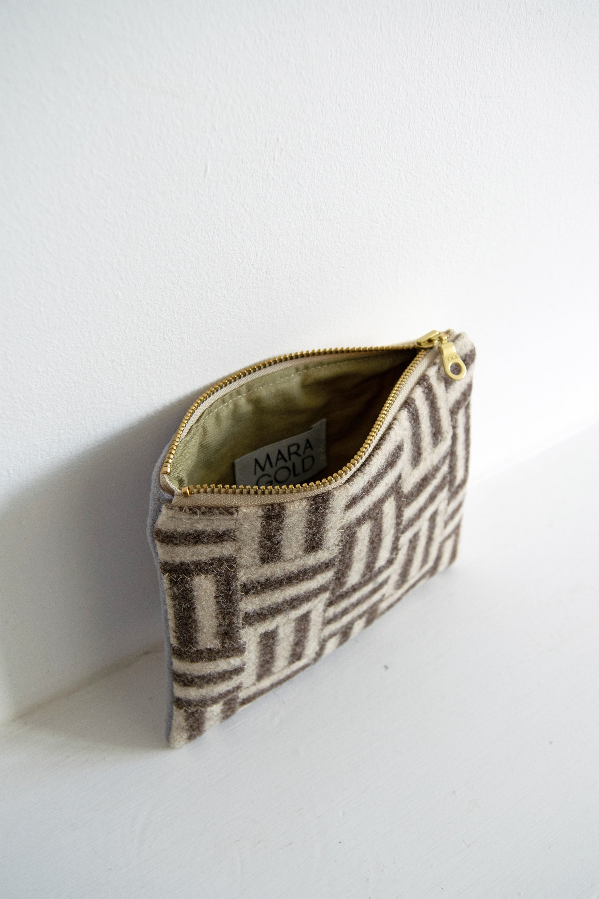 The small checkered wool zip pouch is an ideal way to securely hold items within a larger bag such as a cardholder, keys, lipstick, hair ties and other small items. It is handmade from soft and durable burel wool with a checkered pattern on the front and ivory/ice blue wool on the back. The pouch features a sturdy brass gold metal zipper and is lined in soft cotton fabric to keep your items safe and secure.