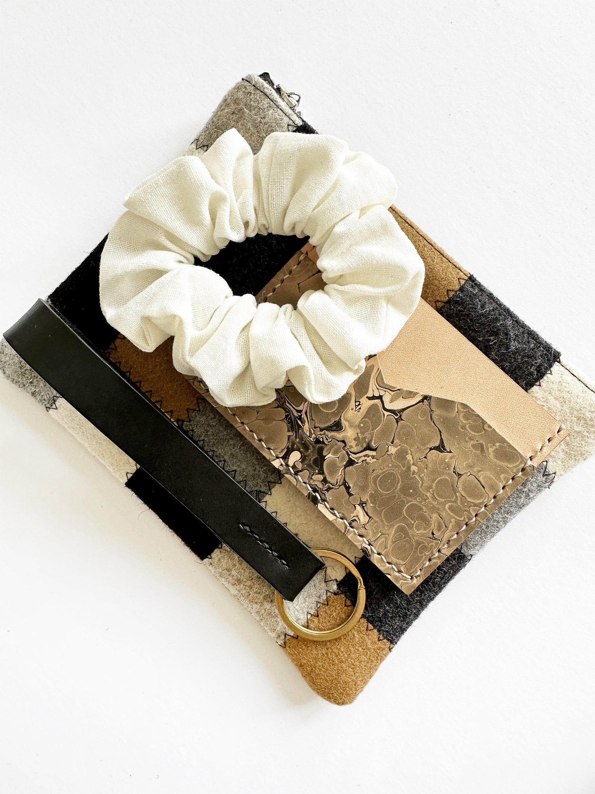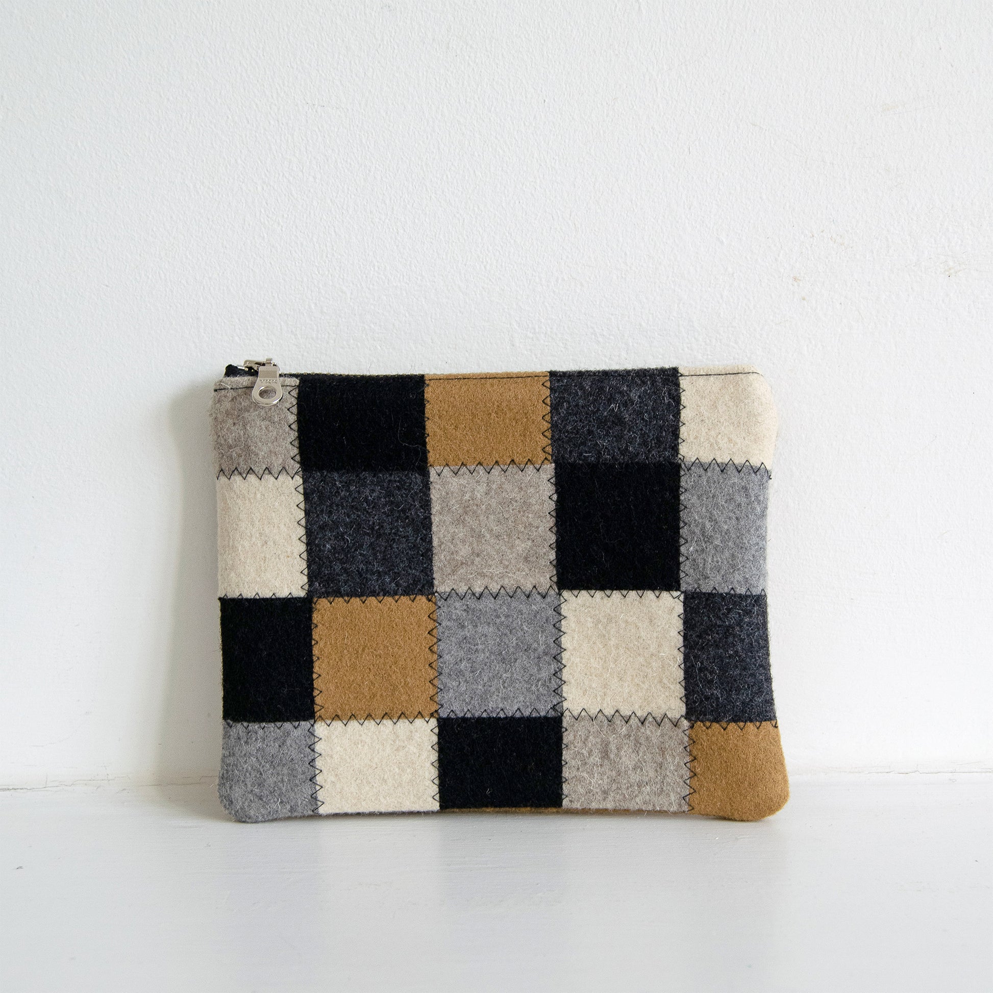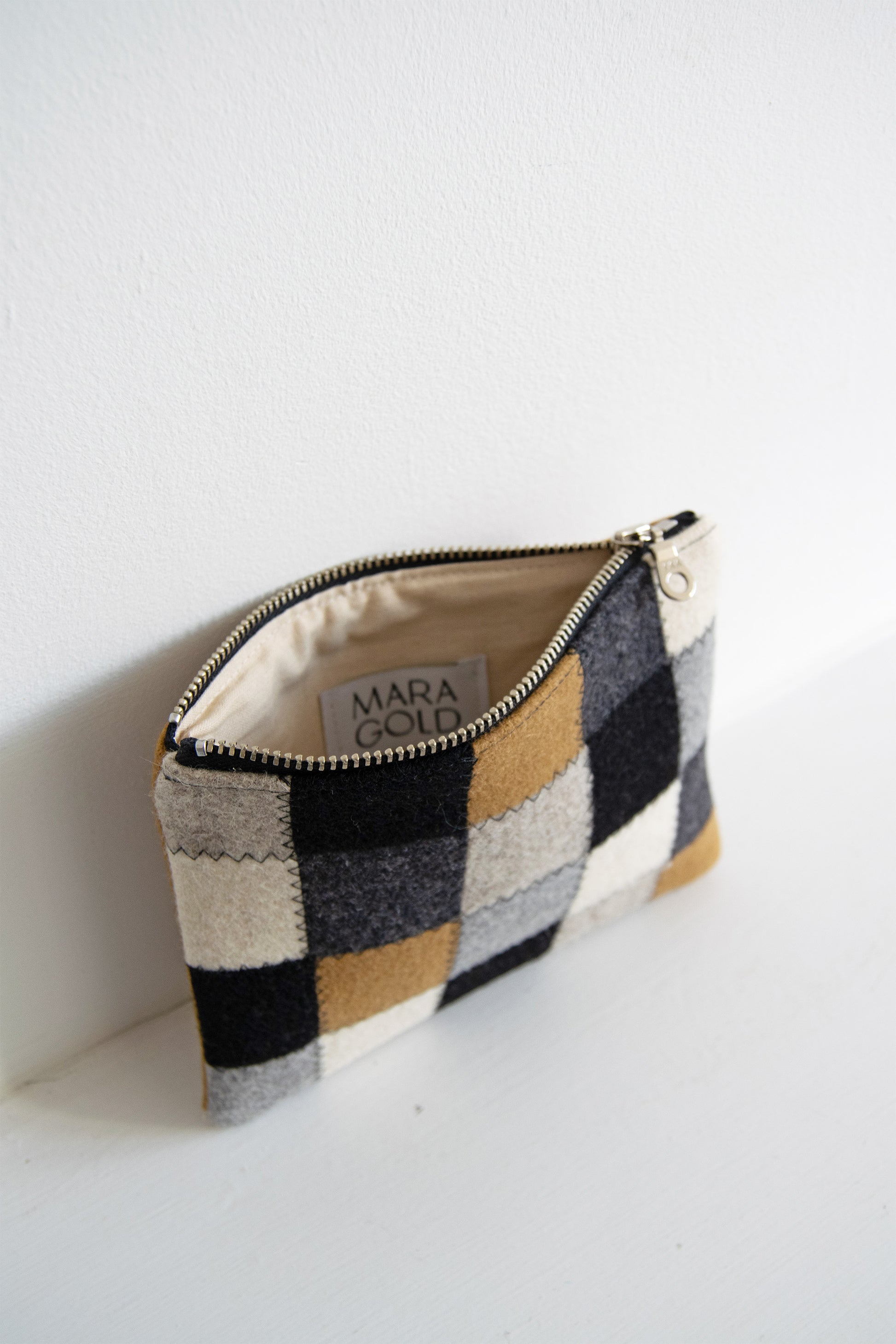 The small checkered wool zip pouch is an ideal way to securely hold items within a larger bag such as a cardholder, keys, lipstick, hair ties and other small items. It is handmade from soft and durable burel wool with a checkered pattern on the front and camel wool on the back. The pouch features a sturdy silver metal zipper and is lined in soft cotton fabric to keep your items safe and secure.