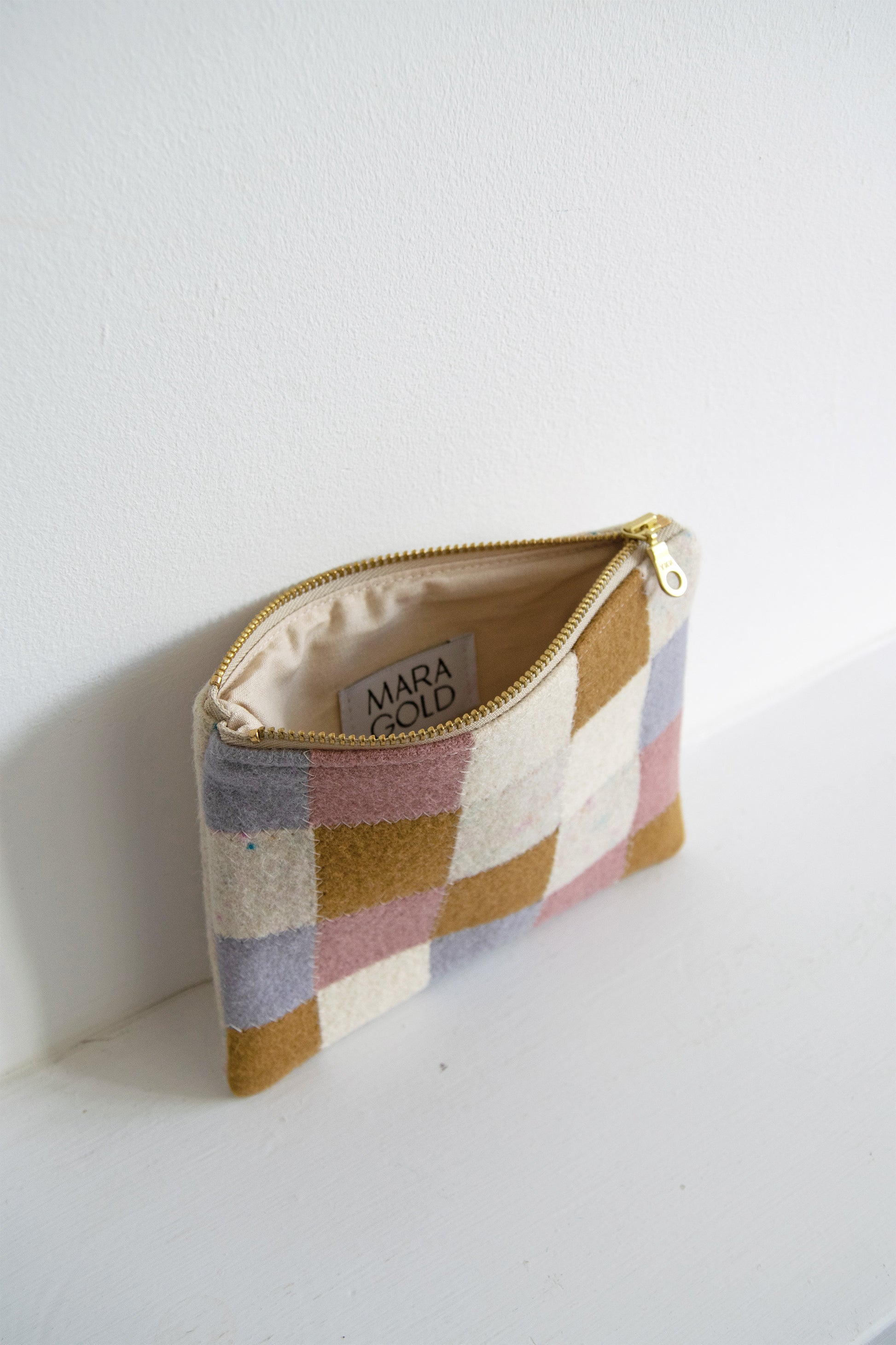 The small checkered wool zip pouch is an ideal way to securely hold items within a larger bag such as a cardholder, keys, lipstick, hair ties and other small items. It is handmade from soft and durable burel wool with a checkered pattern on the front and confetti wool on the back. The pouch features a sturdy brass gold metal zipper and is lined in soft cotton fabric to keep your items safe and secure.